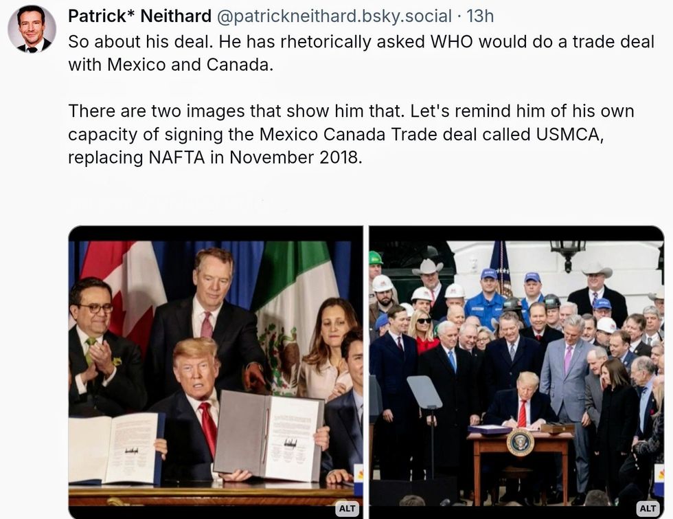 2020: Donald Trump signs USMCA that he negotiated. DJT 2025: “Who’s making these deals? Who would ever sign anything like this?” #DementiaDon