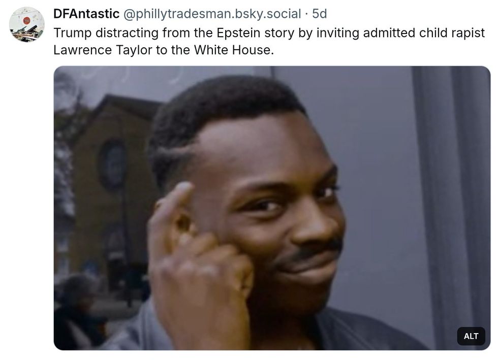 Trump on Epstein: I AM NOT FRIENDS WITH PEDOPHILES. NEVER HAVE. NEVER WILL.Trump with Lawrence Taylor: HELLO THIS IS MY REGISTERED PEDOPHILE FRIEND. PLEASE, MY REGISTERED PEDOPHILE FRIEND, TAKE MY PRESIDENTIAL PODIUM. LET ME ADJUST THAT MICROPHONE FOR YOU.