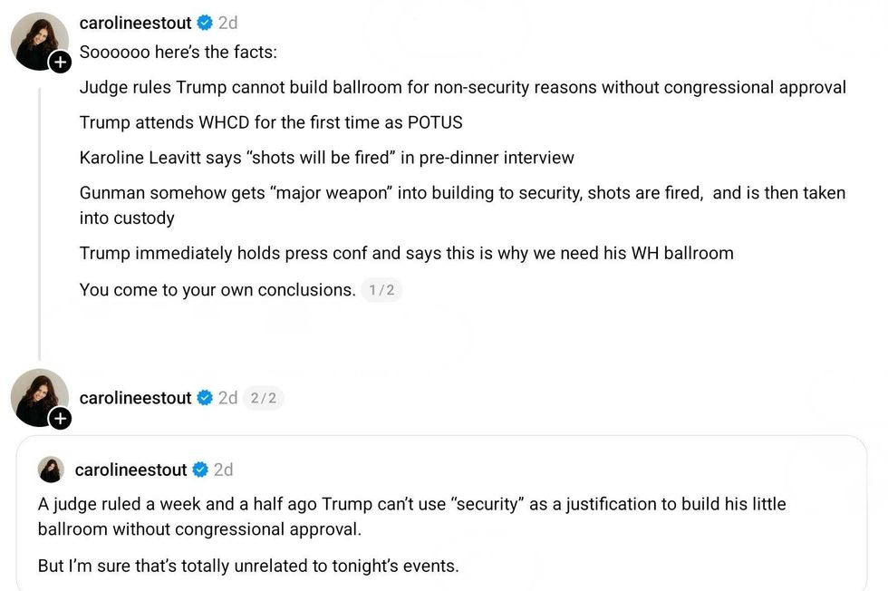 A little after 8:30pm on Saturday night, after White House Press Secretary Karoline Leavitt quipped to Fox News there would be "shots fired" during the WHCD, shots were fired in the Washington Hilton where the event was taking place, but not in the rooms being used for the WHCD.