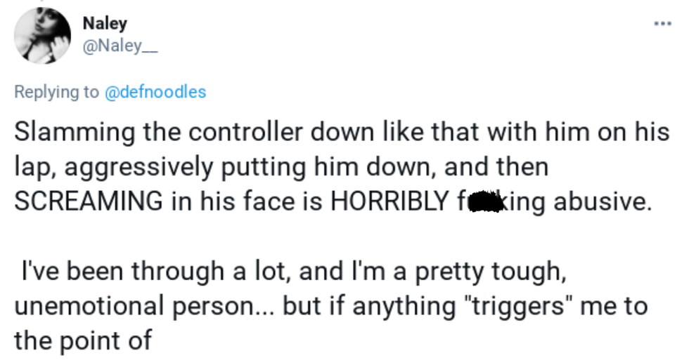 As the video clip—which may be triggering for some viewers—showed, the man erupted after his controller malfunctioned. The clip began when he, with the baby sitting on his lap, slammed the controller on his desk before he launched into his tirade: