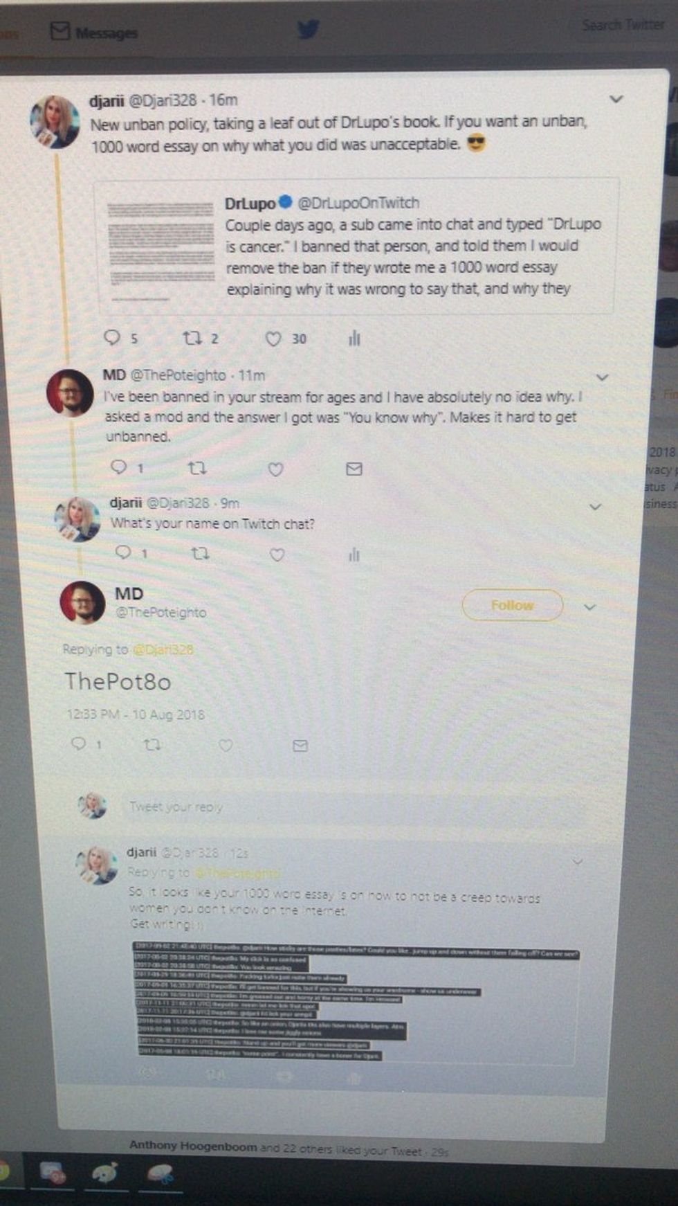 Among the messages in the banned user's chat history was an offer to lick Djarii's armpit and the claim, "I constantly have a boner for Djarii." The 1,000-word essay was still an option, however. The streamer wrote to ThePot80, saying: