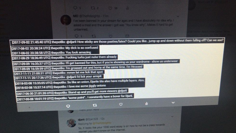 Quickly, a blocked fan named Pot8o approached Djarii online, claiming he had "no idea" why she'd blocked him. A quick investigation revealed she had a very good reason for doing so: he was a major creep.