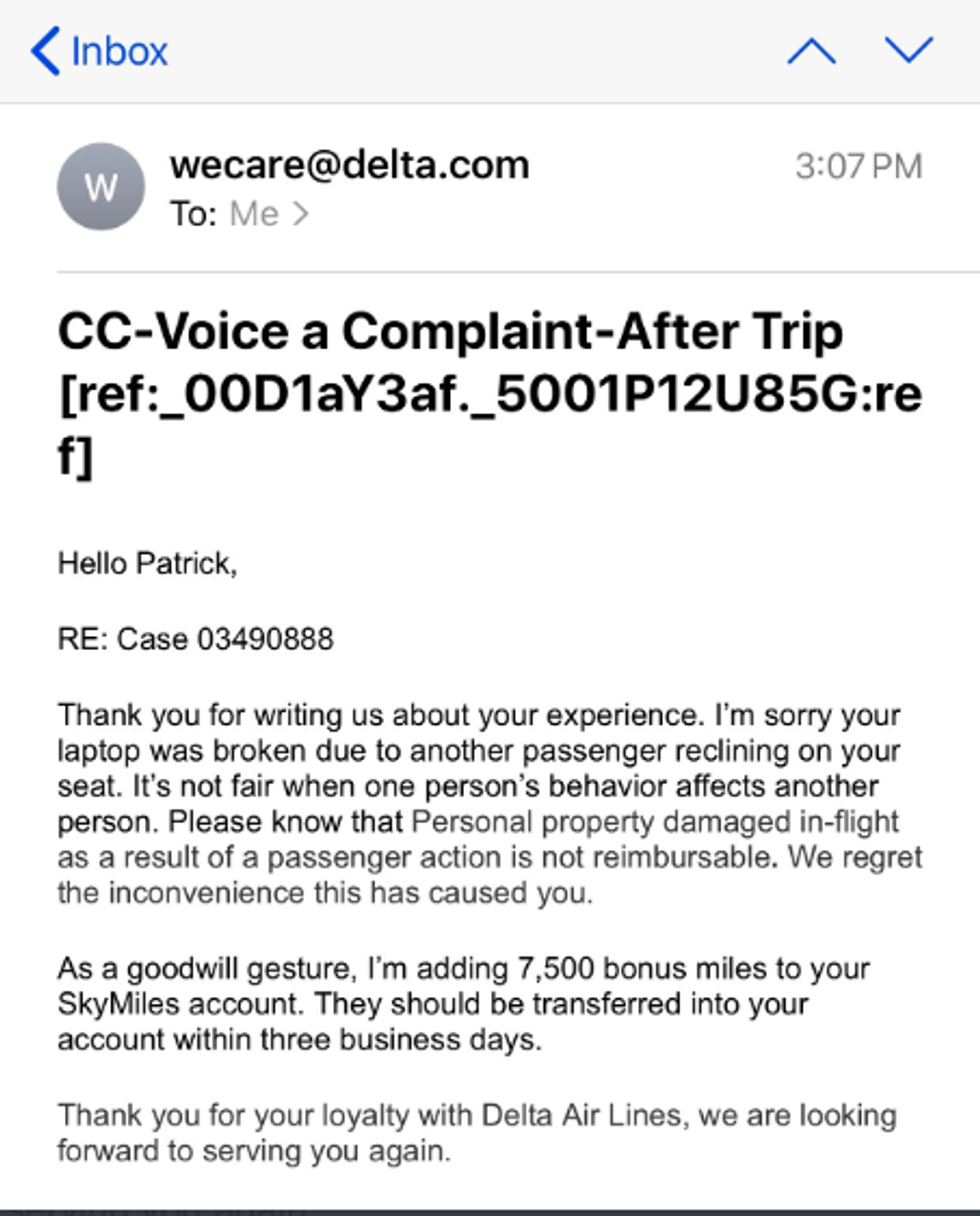 And he was eyes on the prize in the hopes of receiving some compensation from Delta. Cassidy shared a screenshot of Delta's customer service email response, which he clearly found unsatisfactory.