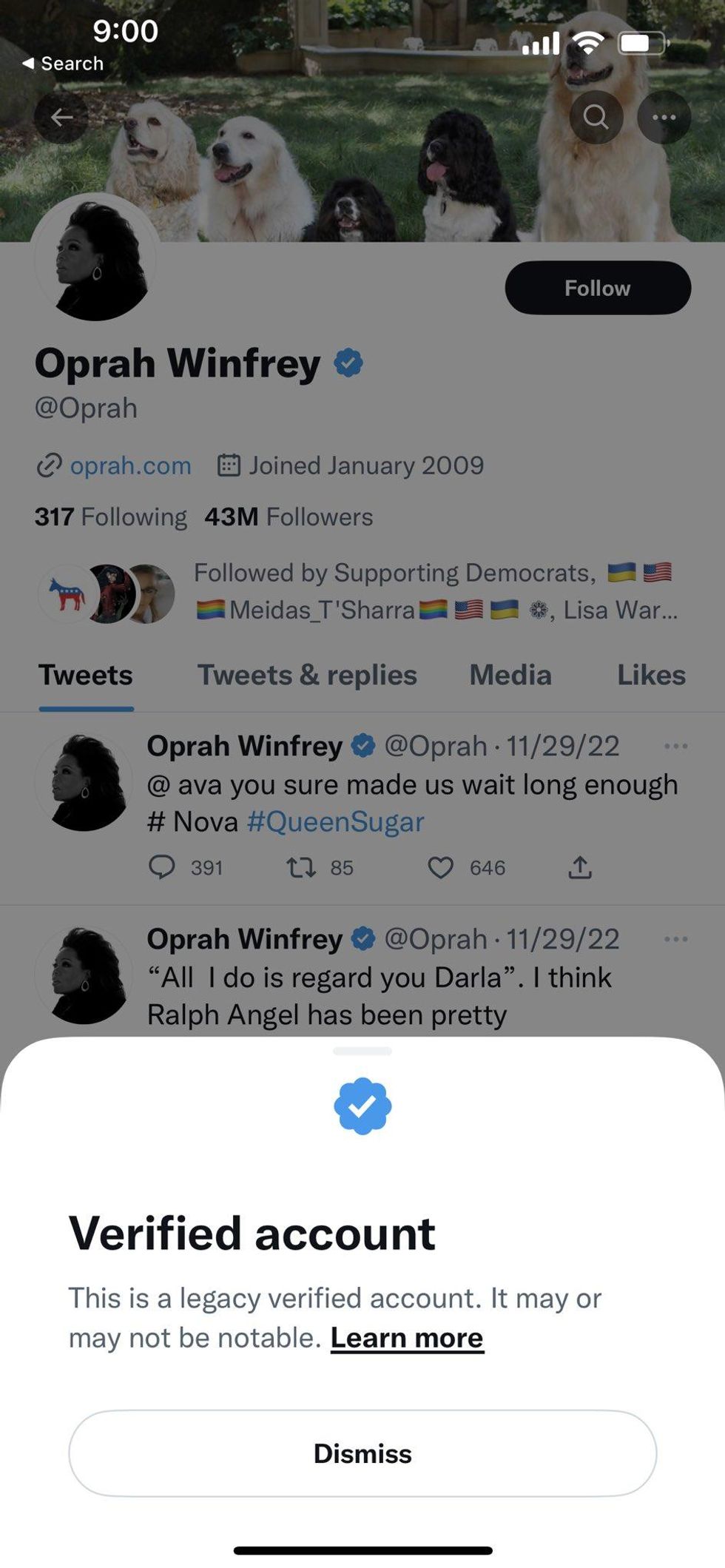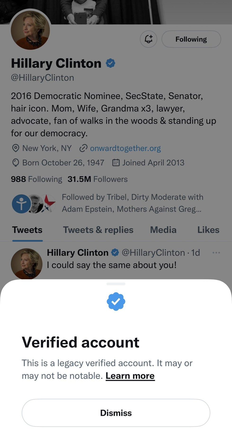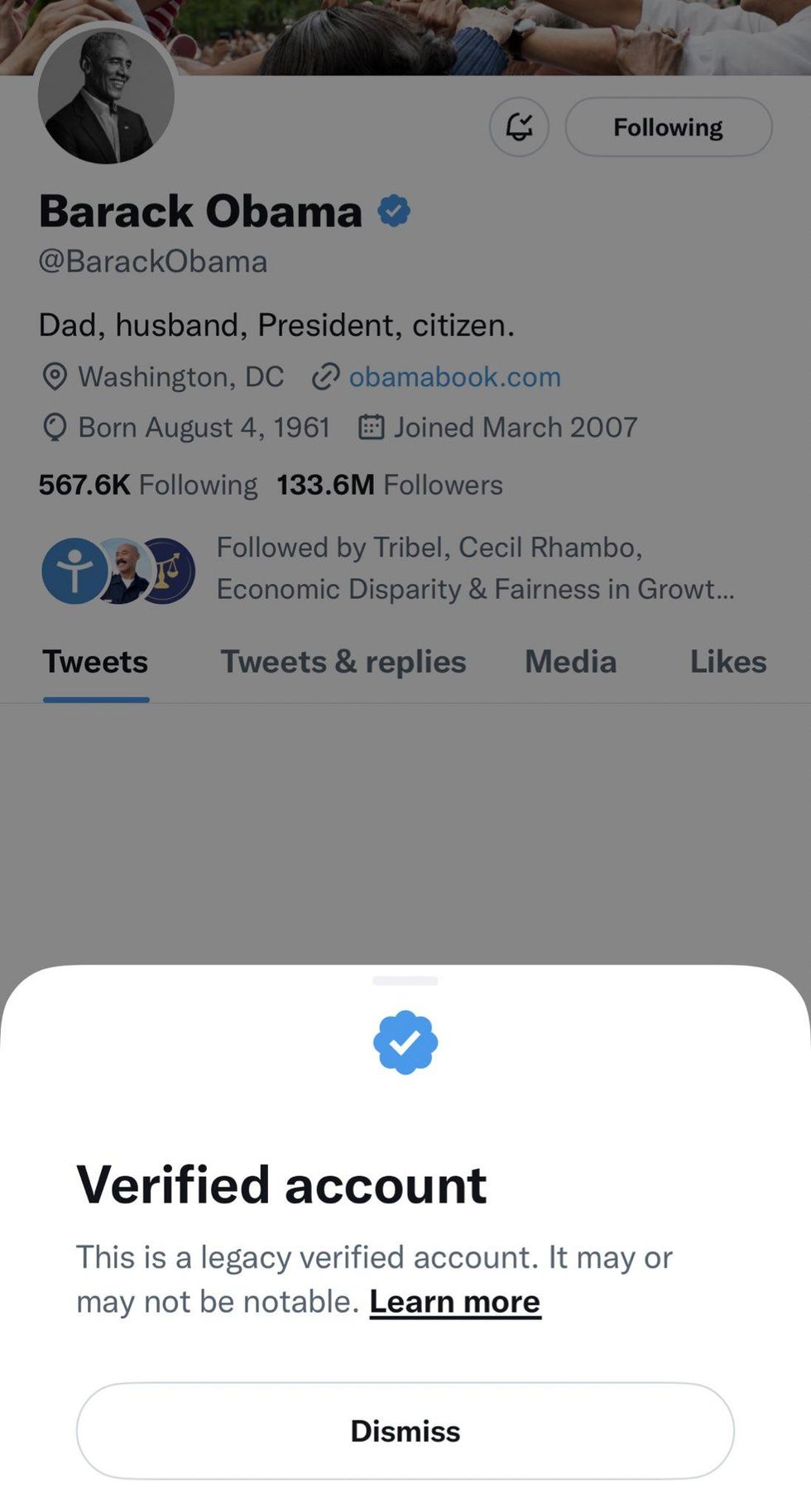 A new disclaimer is showing up when a user taps on the verification mark of a user whose account was verified before Musk implemented Twitter Blue—the new much less stringent system that lets any user pay $8 a month to be verified.