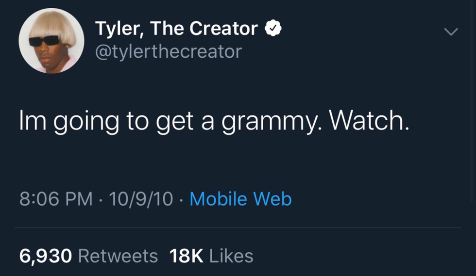 Back in 2010, Tyler tweeted his hopes of winning a Grammy some day...