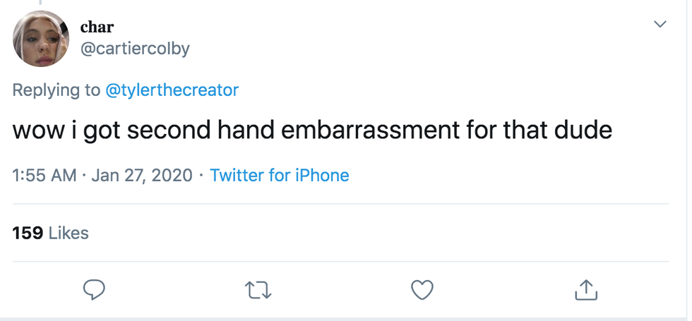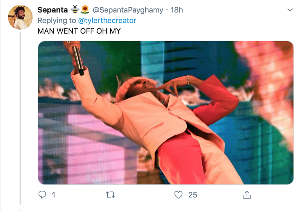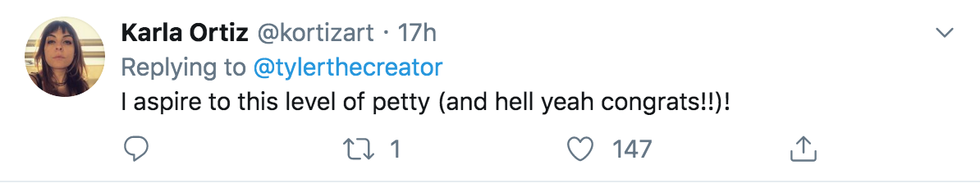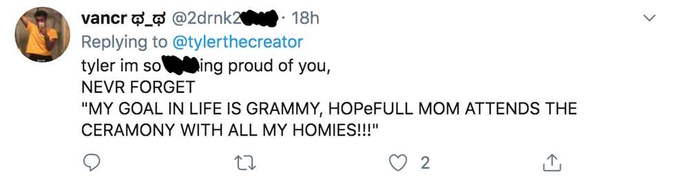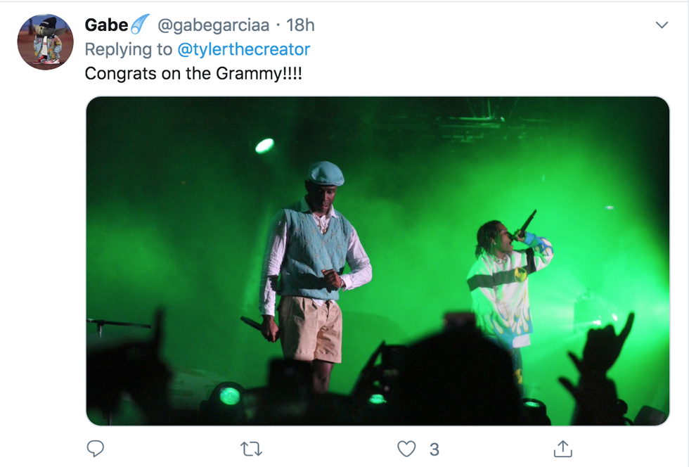 On Sunday night, rapper Tyler, the Creator won his first ever Grammy, and his celebratory Tweet was completely on brand.
