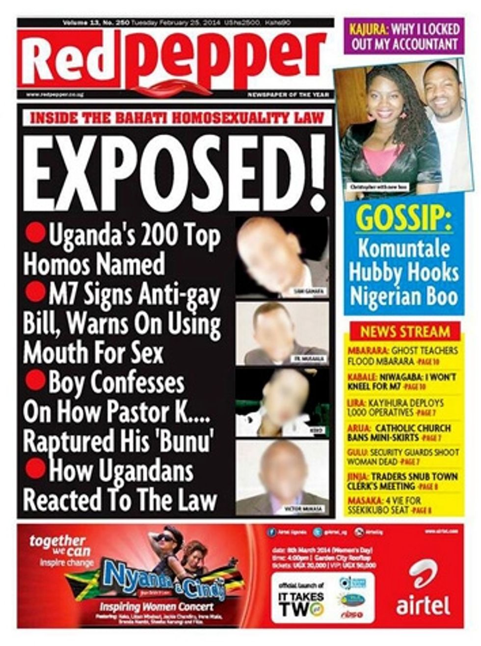 Taking its cue from the new law, a popular Ugandan tabloid printed names, photos, and addresses of 200 alleged homosexuals, inciting a wave of anti-gay violence. Religious leaders called over public address systems for gays to be burned and beaten.
