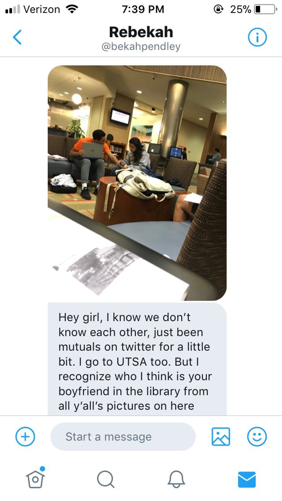 Hey girl, I know we don't know each other, just been mutuals on Twitter for a little bit. I go to UTSA too. But I recognise who I think is your boyfriend in the library from all y'all's pictures on here and he's with a girl and he's being kind of touchy with her. I didn't really know if I should message you/how to tell you but I have been full on cheated on before and girl to girl I'd want to know.I hope this doesn't cause you a lot of problems. I feel really bad but I just thought it'd be wrong to witness it and not say anything, you know? Tell me if you want me to fight him. I'll be here a while.