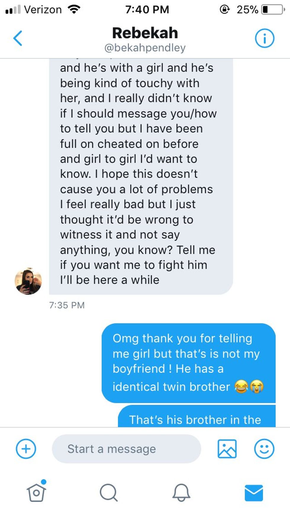 The "cheating" boyfriend was his identical twin.