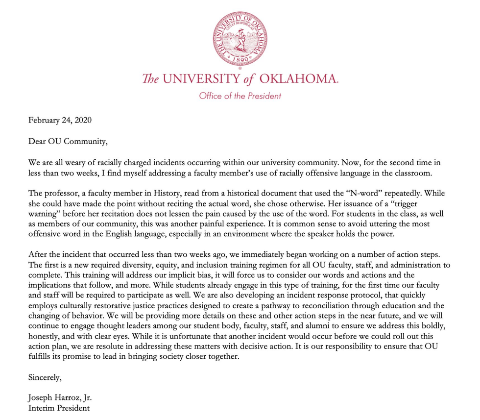 "We are all weary of racially charged incidents occurring within our university community," wrote Harroz Jr., before explaining the professor's ill-advised class conduct.