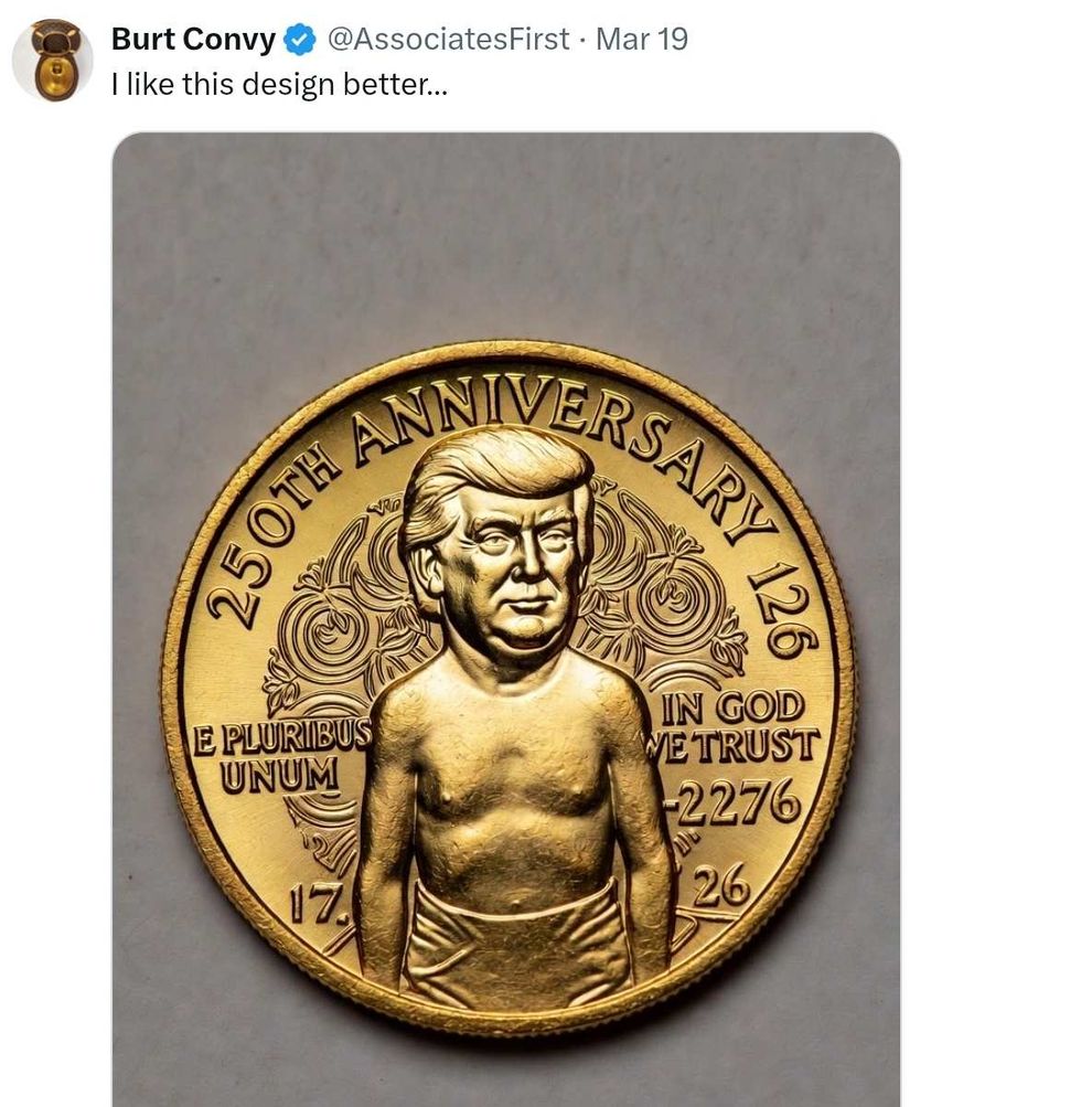 On March 19, the U.S. Commission of Fine Arts (CFA), comprising people appointed by MAGA Republican President Donald Trump, unanimously approved a final design concept proposed for a 24-karat gold United States semiquincentennial commemorative coin.