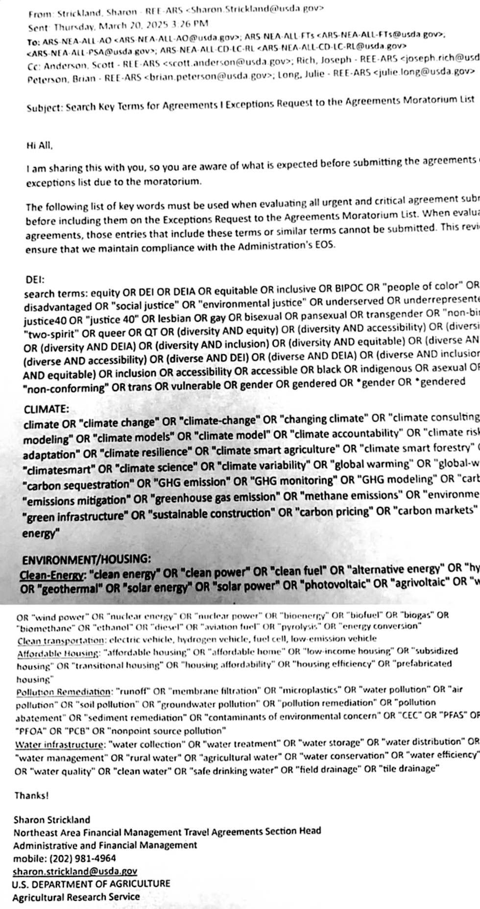 From @moreperfectunion.bsky.social A leaked memo reveals a huge list of terms banned by the USDA’s Agricultural Research Service, including “climate,” “vulnerable,” & “safe drinking water.” The department is responsible for monitoring crops to make sure they are not diseased and can be used for food