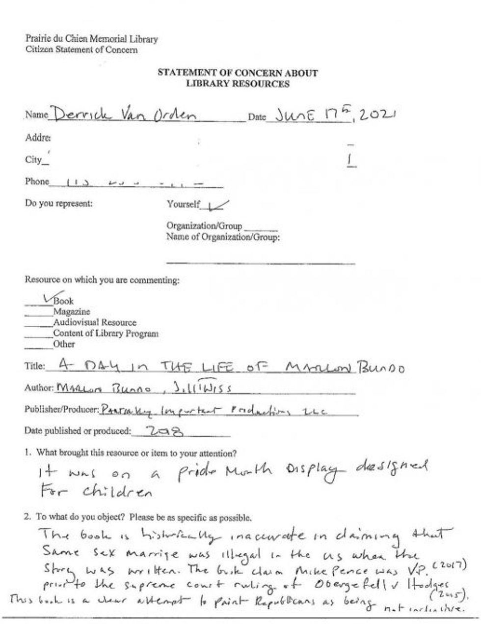 So wait a minute, this guy Derrick Van Orden submitted a written complaint to his local public library that \u2018A Day in the Life of Marlon Bundo\u2019 is \u201chistorically inaccurate\u201d— illusory tenant (@illusory tenant) 1629857768