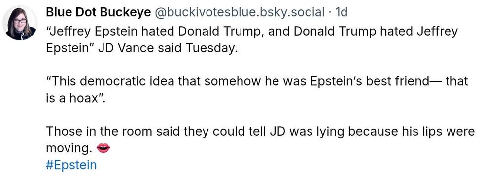 Vance deflected from the obvious lie by telling the sparse crowd what Trump really meant when he said that the files related to late registered sex offender and longtime friend Jeffrey Epstein were a Democratic hoax. Taking a Trump lie and pivoting to a new meaning is a frequent tactic used by the POTUS's enablers when confronted with the truth.