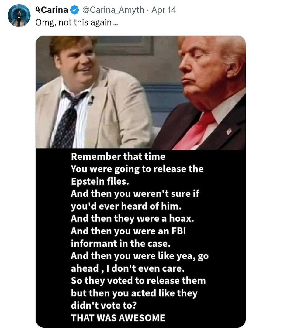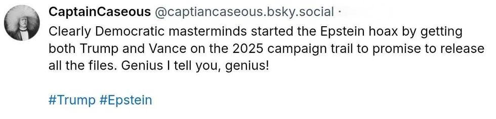 This version ignores the fact that the indictment and arrest of Jeffrey Epstein was done in 2019, during Trump's first term in office by Trump's Department of Justice. And Epstein died while in the federal custody of Trump's DOJ.