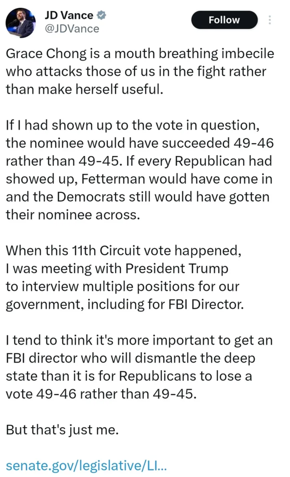 Steve Bannon’s War Room CFO Grace Chong ripped JD Vance for missing the vote on the 11th Circuit judge. Vance responded that Chong is “a mouth breathing imbecile who attacks those of us in the fight rather than make herself useful.” Trump unity! And that's not all you missed today...👇