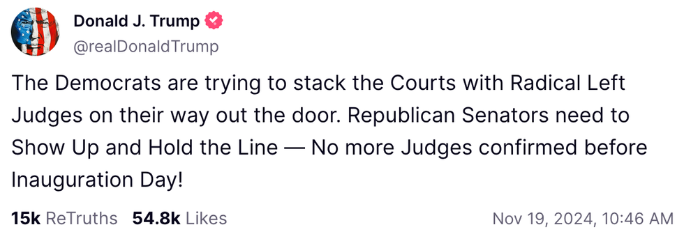 “The Democrats are trying to stack the Courts with Radical Left Judges on their way out the door," Trump wailed on his Truth Social platform on Tuesday, adding: