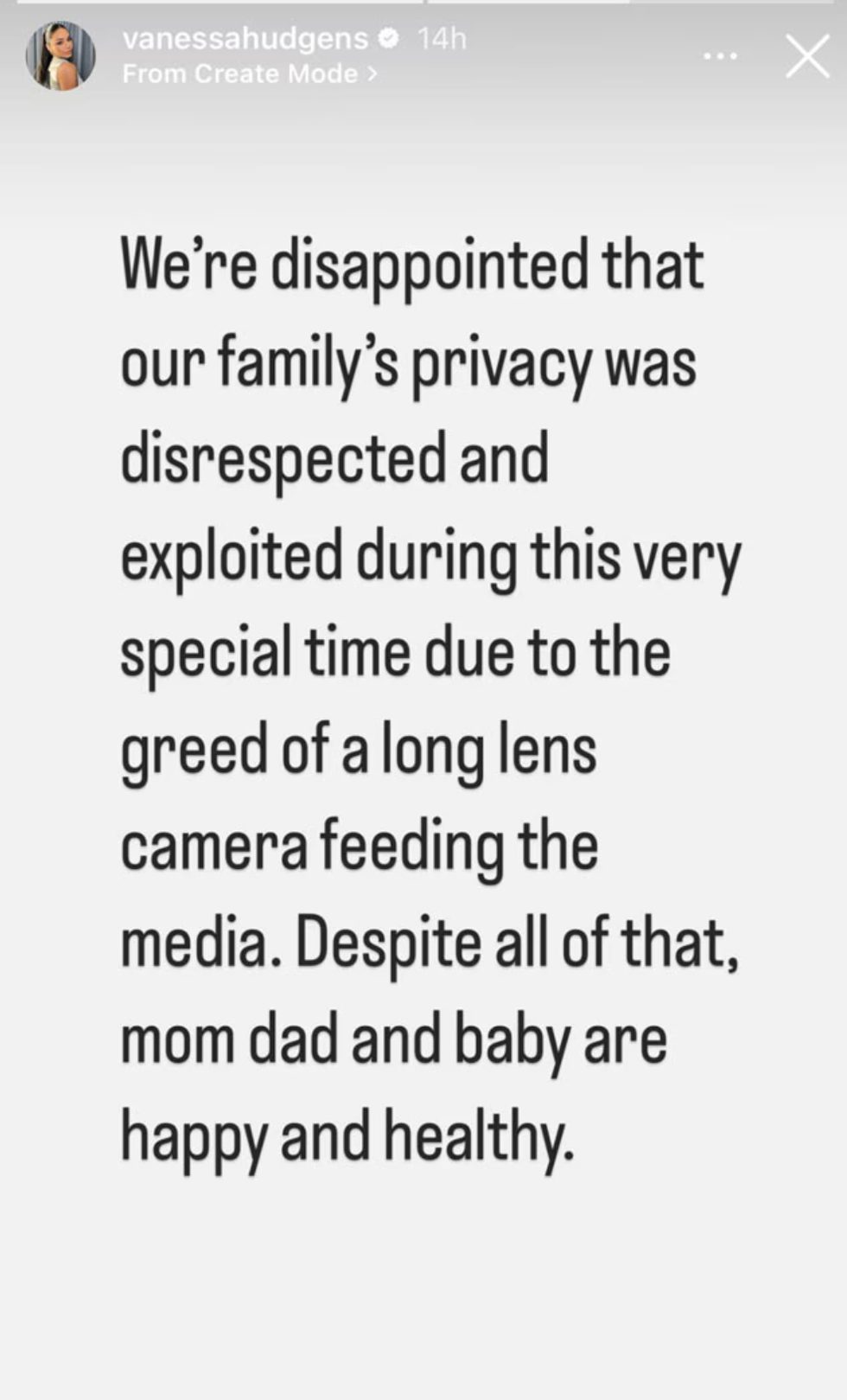 When Hudgens discovered images of her holding her newborn had leaked online, the 35-year-old took to her Instagram story and slammed the paparazzi for this level of invasiveness.