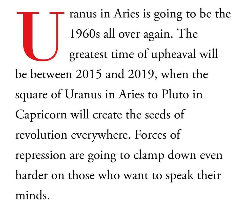 "Other countries will reject our exploitation and demand instead our cooperation. Luckily for us, the horoscope of the U.S.A. is strongly influenced by Venus and Jupiter, so we'll never go totally broke or hungry. We will, however, have to play ball with the rest of planet Earth as we never have before."