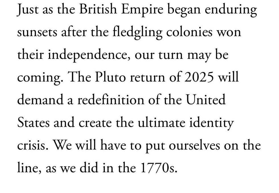 July 4, 1776, is observed as the founding of the United States—making the country's astrological sign cancer—as it's the date on the Declaration of Independence, so Pluto's return came just in time for the country's Bisesquicentennial, or 250th year, in 2026.