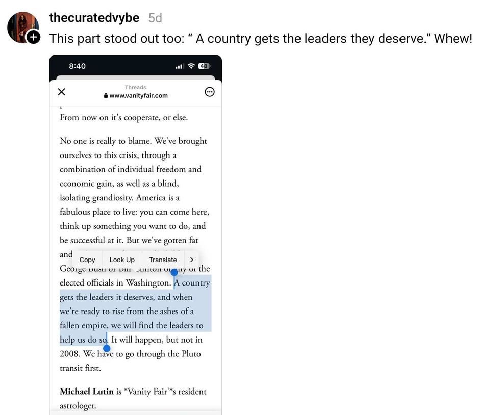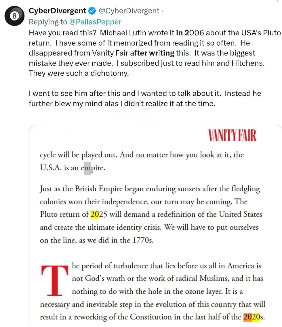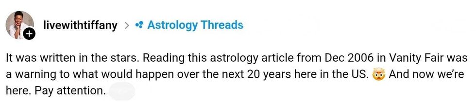 After their almost 20-year-old article got notice on social media, Vanity Fair decided to cover the story themselves with an article titled "Almost Twenty Years Ago, Vanity Fair Published America’s Horoscope. Was It Prescient?."