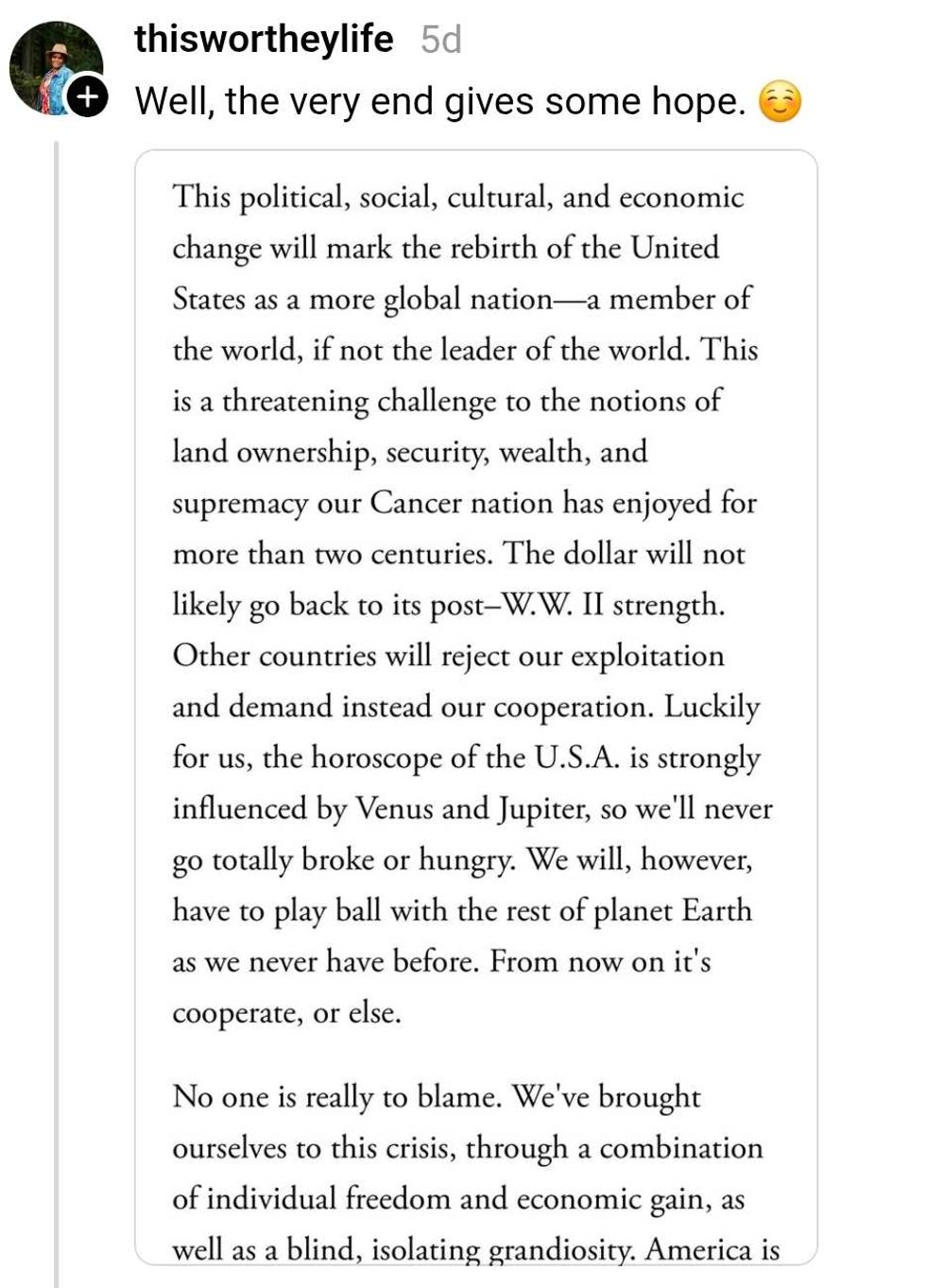 "This political, social, cultural, and economic change will mark the rebirth of the United States as a more global nation—a member of the world, if not the leader of the world. This is a threatening challenge to the notions of land ownership, security, wealth, and supremacy our Cancer nation has enjoyed for more than two centuries. The dollar will not likely go back to its post–W.W. II strength."