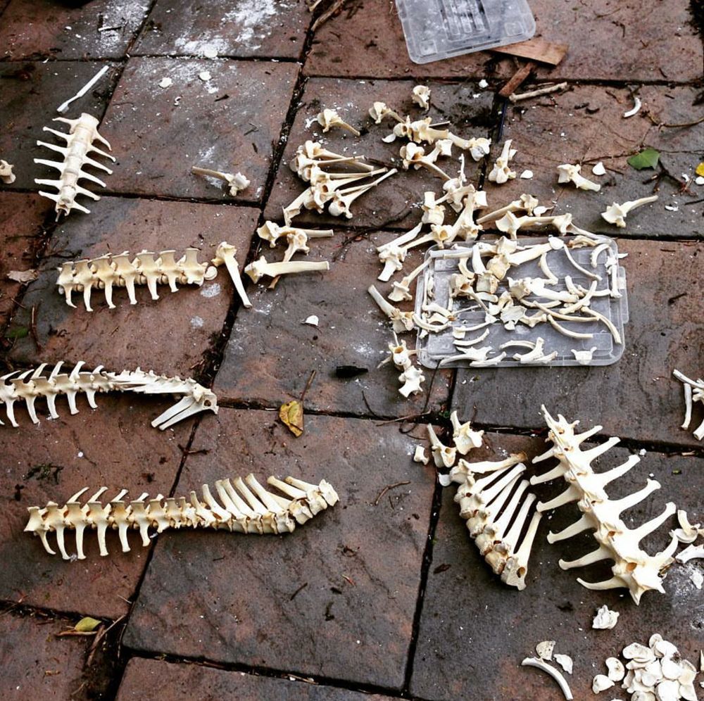 Once macerated – the softening or breaking of an object – Kat then digs up the animal bones and cleans them with water and toothpaste, before pulling them apart and soaking them in hydrogen peroxide.