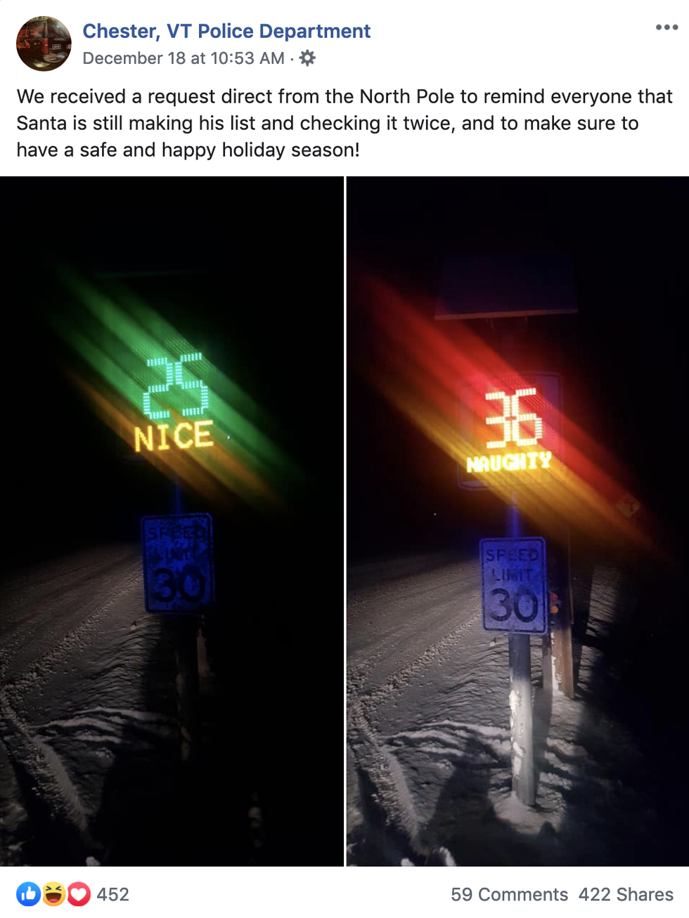 The Chester police installed a radar sign that looks like something Old Saint Nick devised, and well, you'd better watch out.