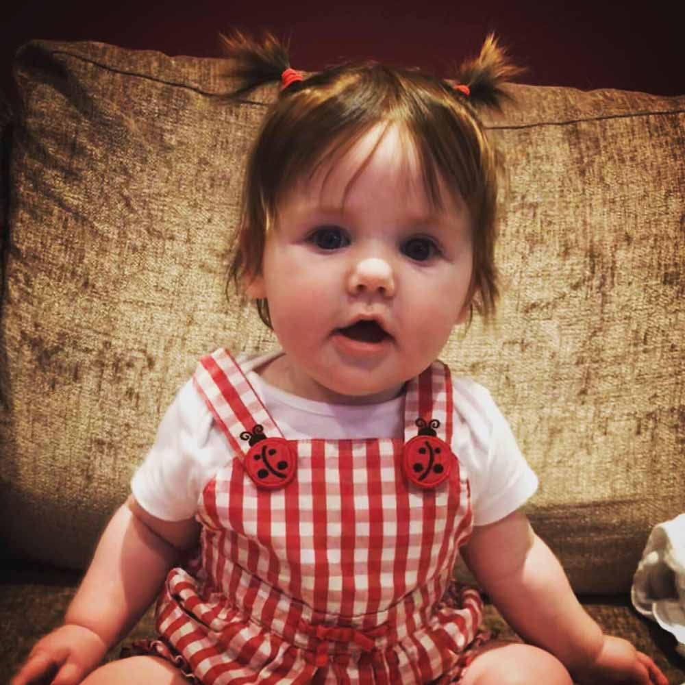 Already able to wear her mane in bunches – which see her compared to Monsters, Inc. character, Boo – the tot was born on February 25 at Tunbridge Wells Hospital, weighing 8lb 8oz, with a full head of dark hair, complete with natural blonde flecks.