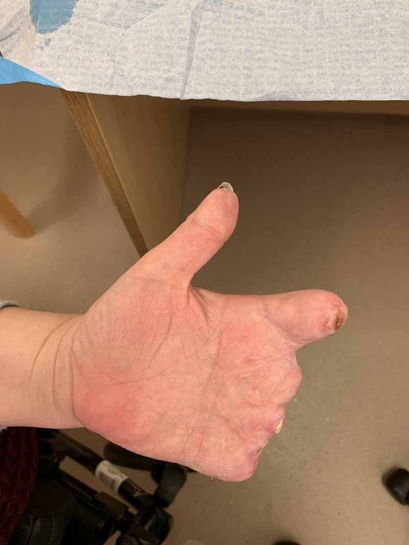 Since October 2018, she has had five operations on her hands – two on the right and three on the left – removing her fingers. The surgery has also entailed grafting skin from her abdomen onto her hands, where there was no surplus and the blood supply was poor.