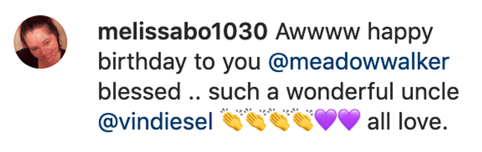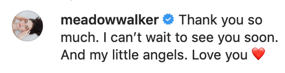 Meadow responded with thanks and said she was looking forward to seeing him and his "little angels," referring to Diesel's children—daughter Hania Riley, 11, son Vincent Sinclair, 9, and daughter Pauline, 4.