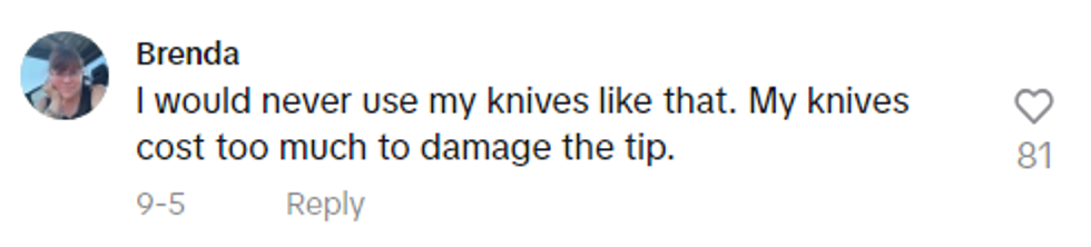 Then, suddenly, she pokes the top of the lid with a knife before showing the lid coming off.
