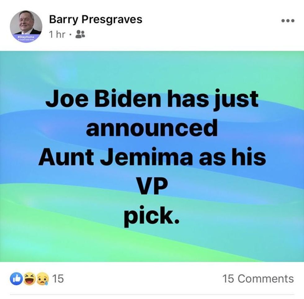Mayor Presgraves posted a Facebook status that commented on Biden's potential VP selections. Right now, things seem to be narrowed down to a final four women. Three of the four—Kamala Harris, Susan Rice and Karen Bass—are Black.