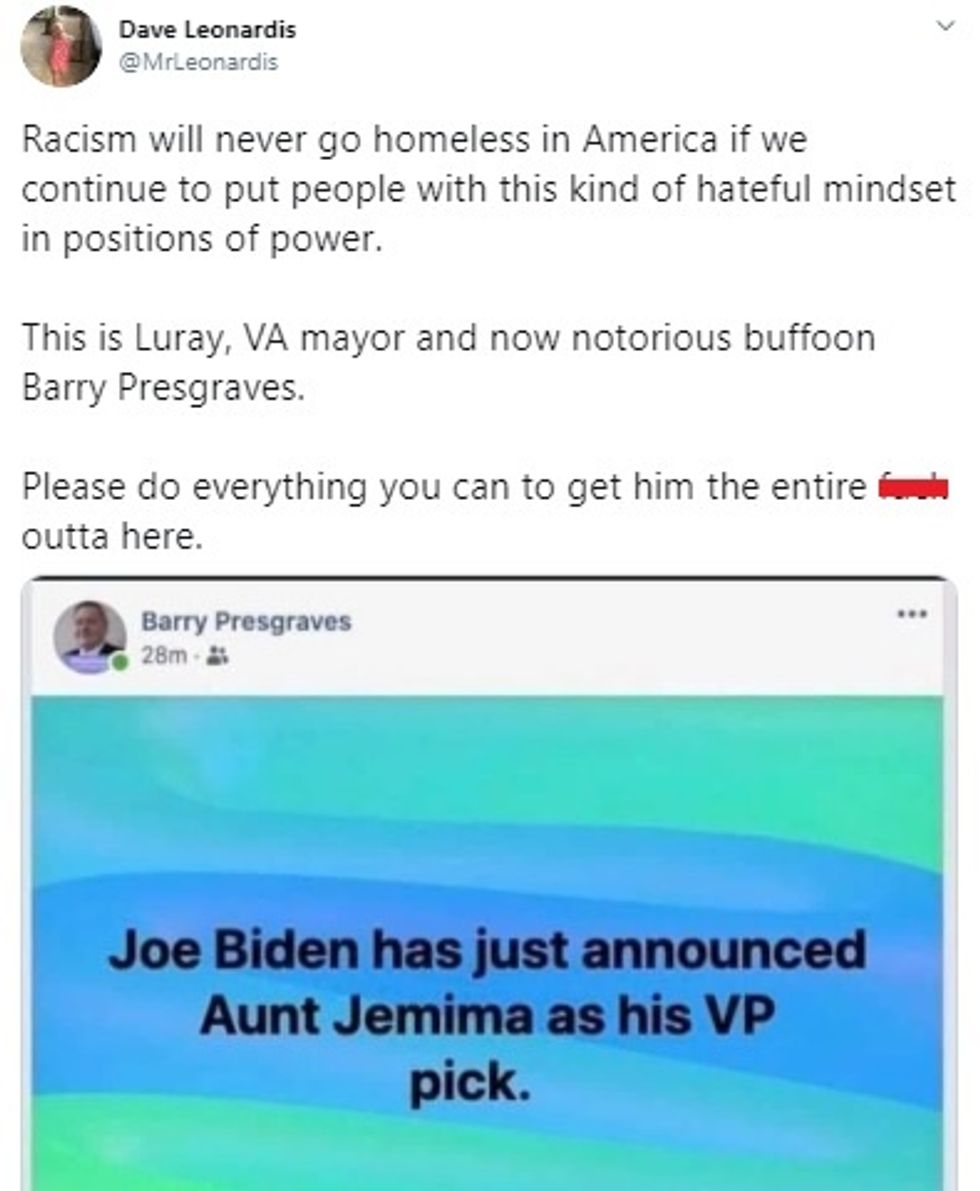 Council member Ron Vickers told outlets that Presgraves doesn't speak for him, the council, or the town. "The town of Luray is better than that." he said.