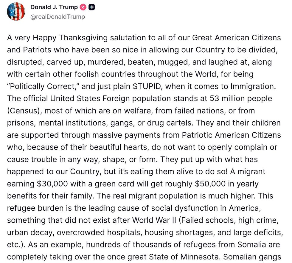 On Thanksgiving Day, Trump took to Truth Social to post a screed of racist, xenophobic, White nationalist lies about immigrants in general and Minnesota specifically. In keeping with past holidays and his penchant for using them to attack his rivals or spread bigotry and hatred, it was Trump's only Thanksgiving post for the nation.