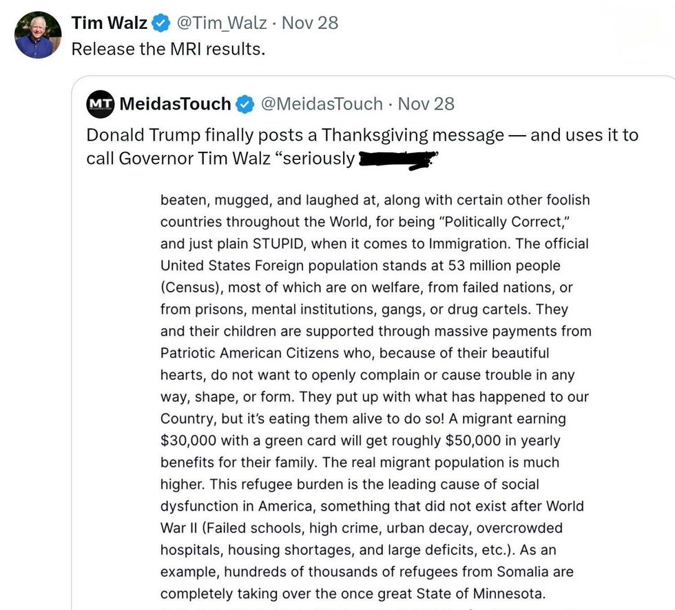 Governor Walz, against whom Trump holds one of his childish, petty grudges because Walz dared be his political opponent in 2024, responded to Trump's unhinged rant on X with a repost of Trump's Thanksgiving Day tantrum.