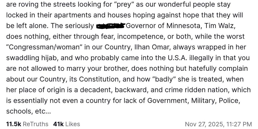 "The seriously [ableist r-word slur] Governor of Minnesota, Tim Walz, does nothing, either through fear, incompetence, or both, while the worst 'Congressman/woman' in our Country, Ilhan Omar, always wrapped in her swaddling hijab, and who probably came into the U.S.A. illegally in that you are not allowed to marry your brother, does nothing but hatefully complain about our Country, its Constitution, and how 'badly' she is treated, when her place of origin is a decadent, backward, and crime ridden nation, which is essentially not even a country for lack of Government, Military, Police, schools, etc…"