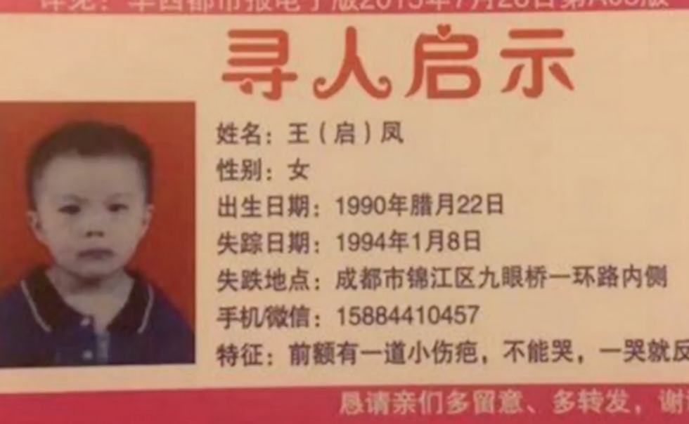 On January 8, 1994, Wang Mingqing and his wife, Liu Dengying, were busy with a transaction working at a fruit stand in Chengdu, Sichuan Province, when their 3-year-old daughter, Qifeng, went missing.