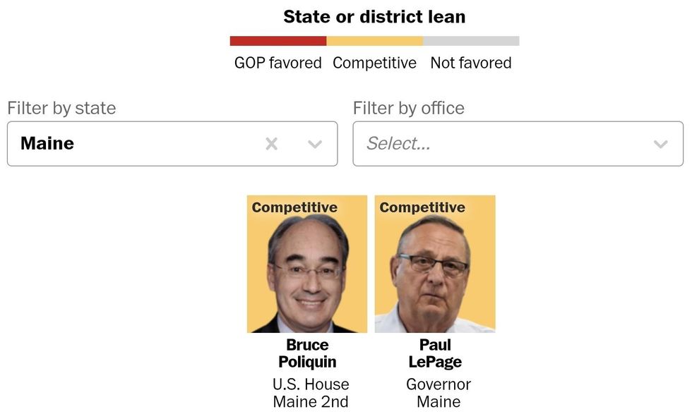 For example, in Maine Republican candidates Bruce Poliquin and Paul LePage are in competitive races with their Democratic rivals, Representative Jared Golden and Governor Janet Mills.