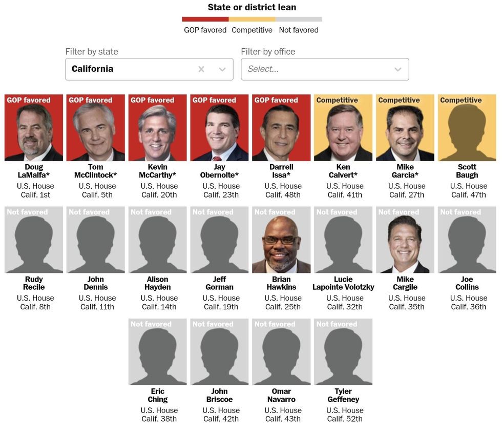 Only five—all incumbents—are expected to win, including House Minority Leader Kevin McCarthy.