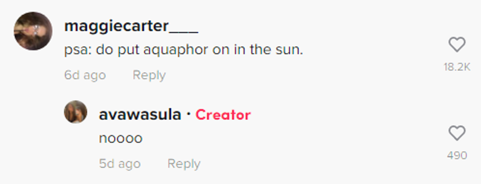 She urged anyone to not repeat her first mistake of applying Aquafor before going out in the sun, but if they did, they should not repeat her second mistake of exfoliating her peeling lips. Instead, use lip balm or sunscreen before going outside, and leave agitated lips alone.