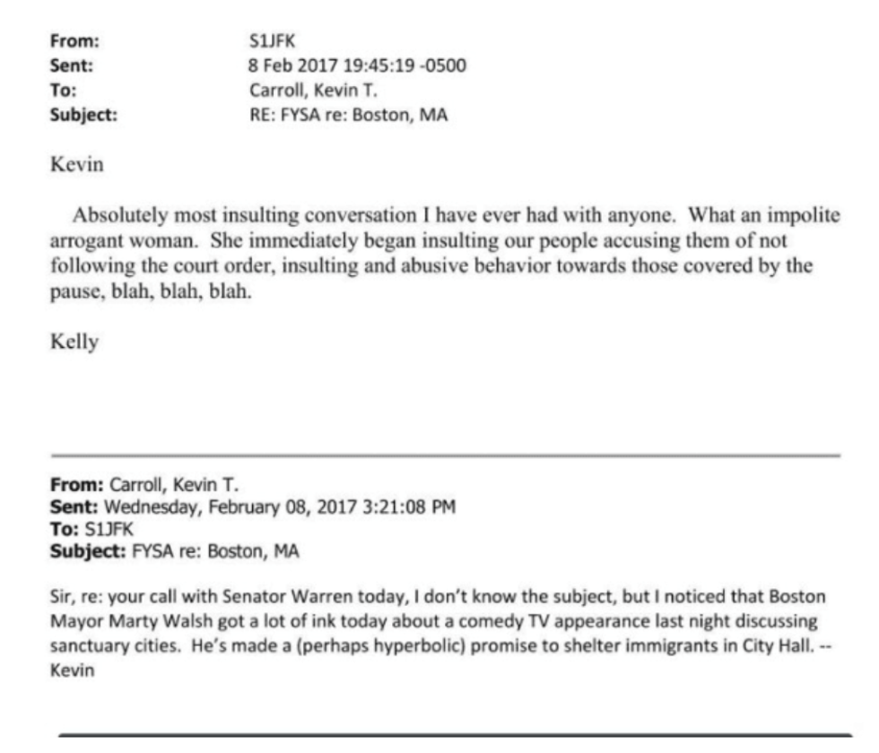 Buzzfeed News is reporting that, in a private email to Kevin Carroll, Kelly referred to Elizabeth Warren, the Democratic Senator from Massachusetts, as an "impolite, arrogant woman" while referring to a conversation he had with Warren about Trump's illegal Muslim travel ban.