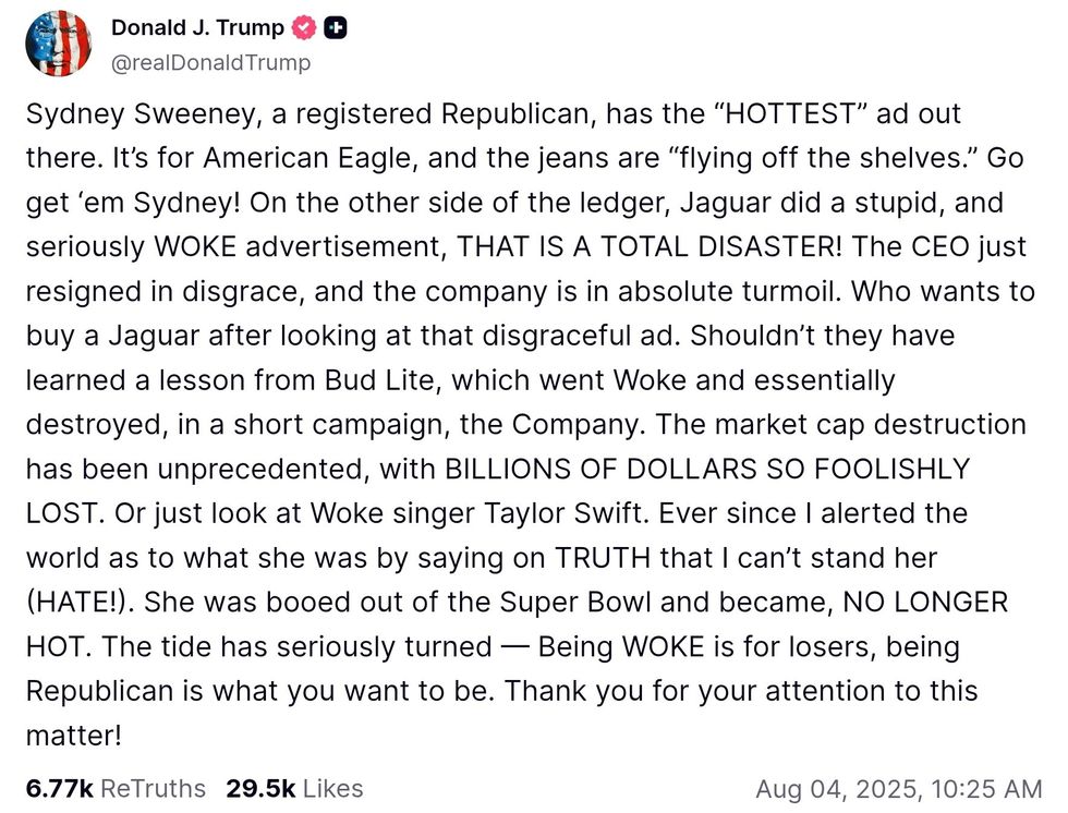 "Sydney Sweeney, a registered Republican, has the 'HOTTEST' ad out there. It’s for American Eagle, and the jeans are 'flying off the shelves'. Go get ‘em Sydney!"