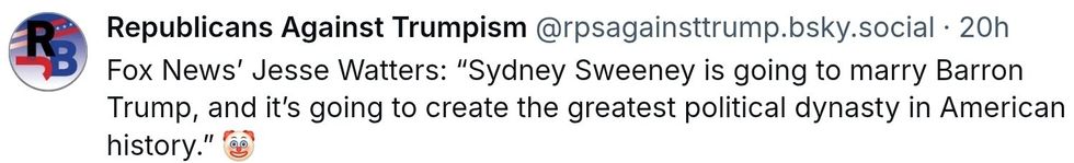 This time, Watters incorporated Trump’s 19-year-old son Barron and 27-year-old registered Republican actor Sydney Sweeney into his fantasy.