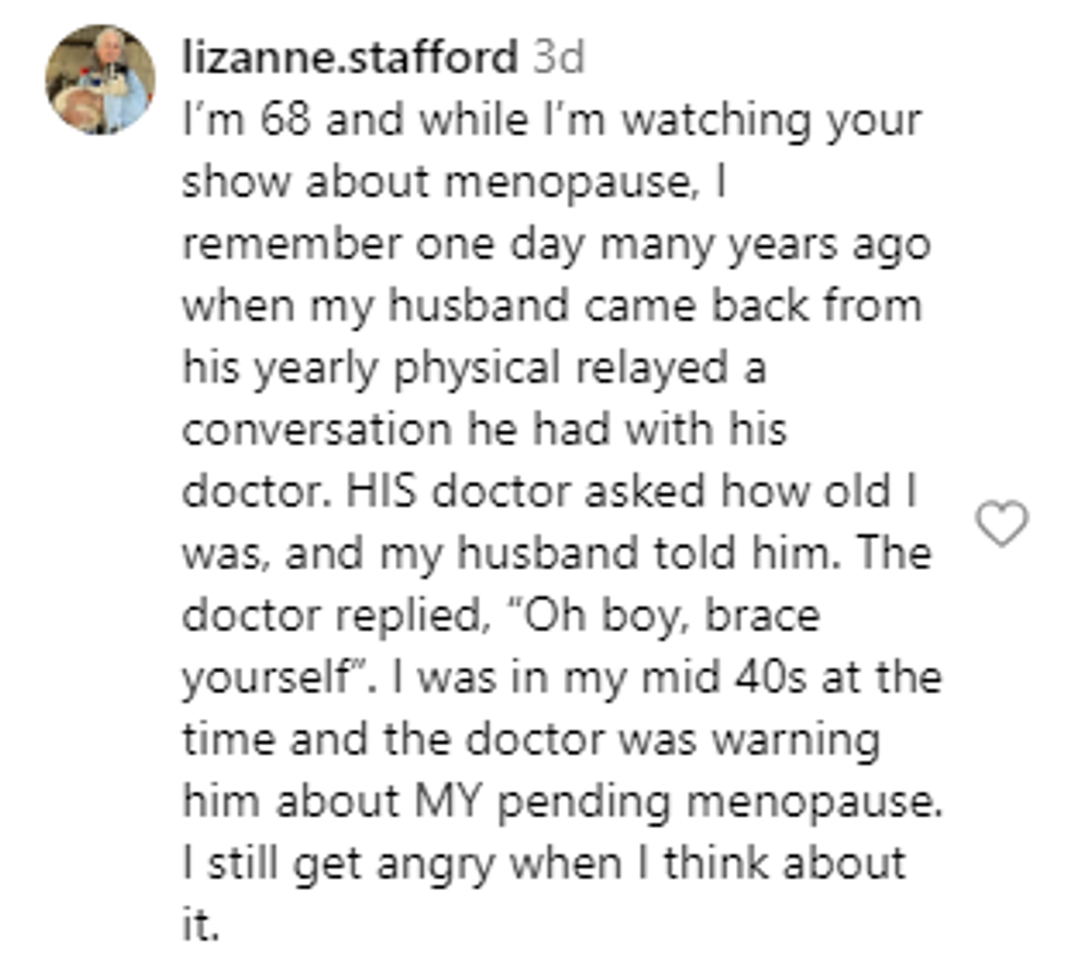 "I said, 'No, well, look, I'm in menopause, and I have treatment, and I have this patch, and I'm wearing it, and it leaves this... I'm old. Should I just leave?'"