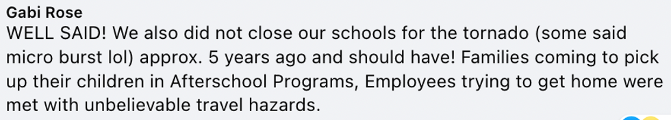 "...I understand that some people believe that folks 'are soft' these days. Yes, those people probably 'never had an early dismissal for severe storms growing up' or they 'had to walk 5 miles in home in a thunderstorm.'..."