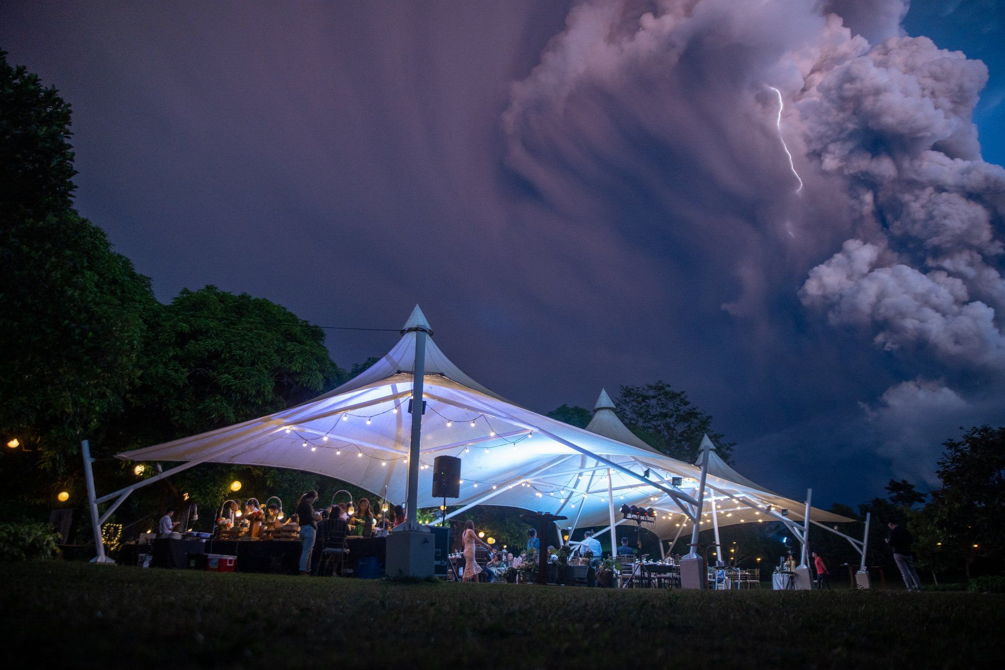 A couple celebrated their wedding in Cavite, the Philippines, despite the Taal volcano erupting around 20km away from the venue.