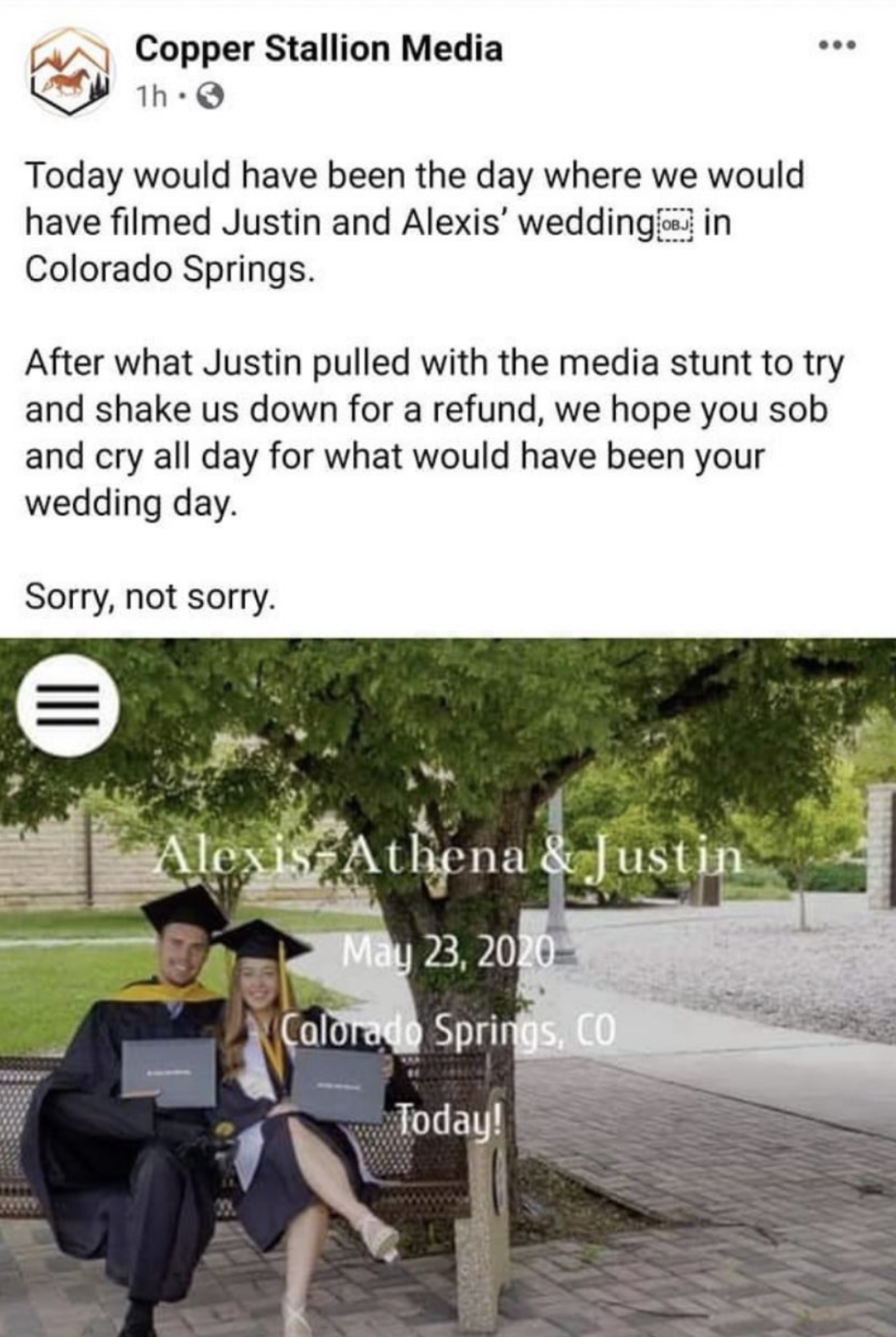 "After what Justin pulled with the media stunt to try and shake us down for a refund, we hope you sob and cry all day for what would have been your wedding day."