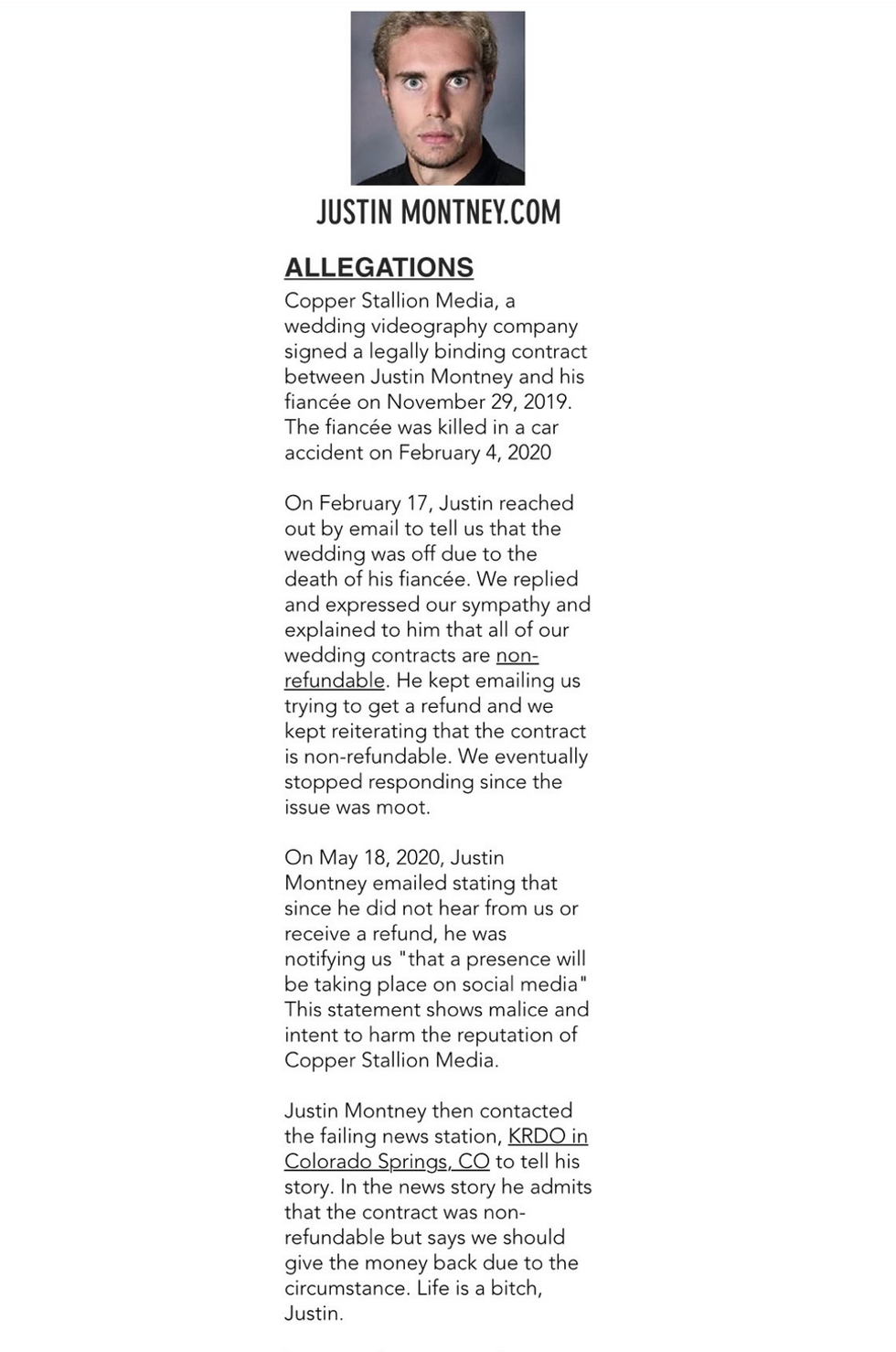 When Montney contacted Copper Stallion Media on February 17 to collect his deposit, the videography company told him the prepaid fee was nonrefundable regardless of circumstances. Montney said Copper Media then extended their services for his next wedding, which he thought was "very insensitive."