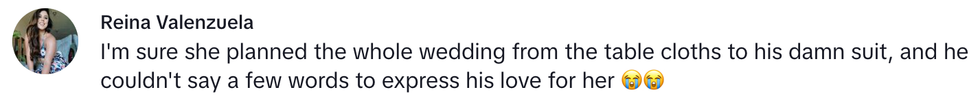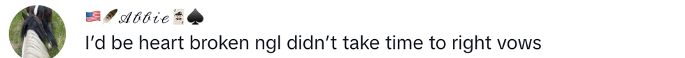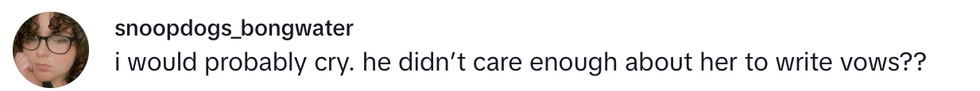 A video posted to TikTok by @ckentertainmentservices shows the moment this Cody delivered his short and not-so-sweet vows, simply swearing to his blushing bride: